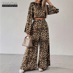 Conjunto de dos piezas informal para mujer transfronteriza europea americana 2025, Top de manga larga holgado cómodo con estampado de leopardo y pantalones largos